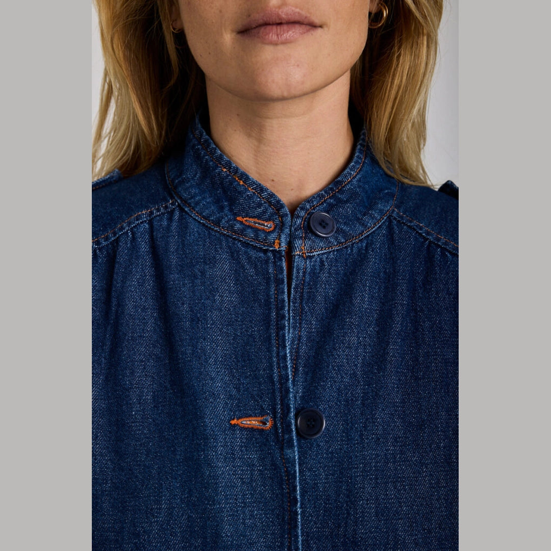 Fabriquée au Portugal, cette veste se distingue par son bleu denim intemporel, ses surpiqûres orange, et des détails soignés : deux poches latérales, fronces aux épaules, boutonnière centrale et bouton en corozo, une matière naturelle.
