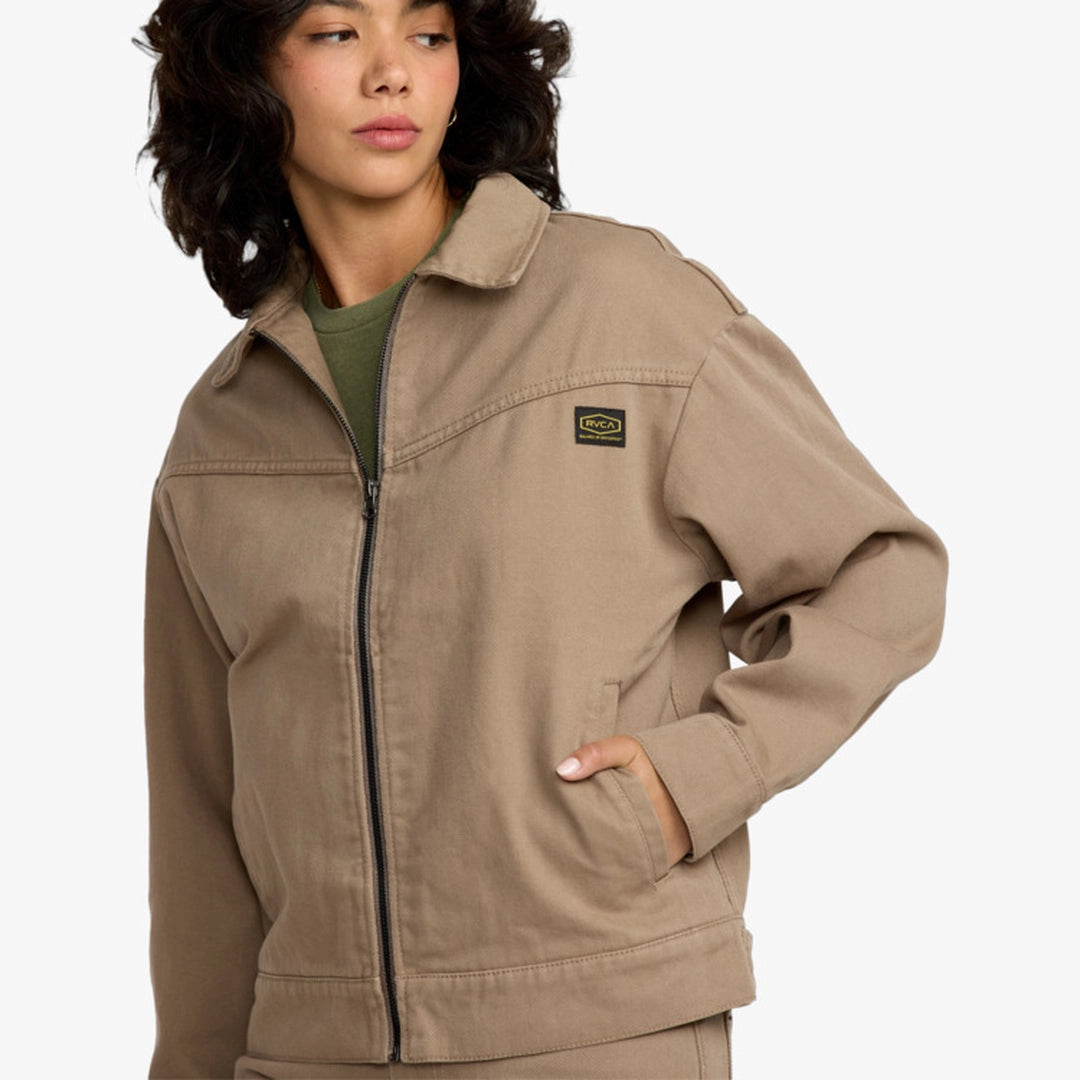 Son modèle ajusté, sa coupe courte et son col classique créent une ligne féminine et dynamique. On retrouve des panneaux contrastés et passepoilés, signatures visuelles fortes de la gamme Dayshift, ainsi qu’une étiquette RVCA Dayshift qui vient compléter la finition. La boucle de suspension intérieure ajoute une touche pratique.