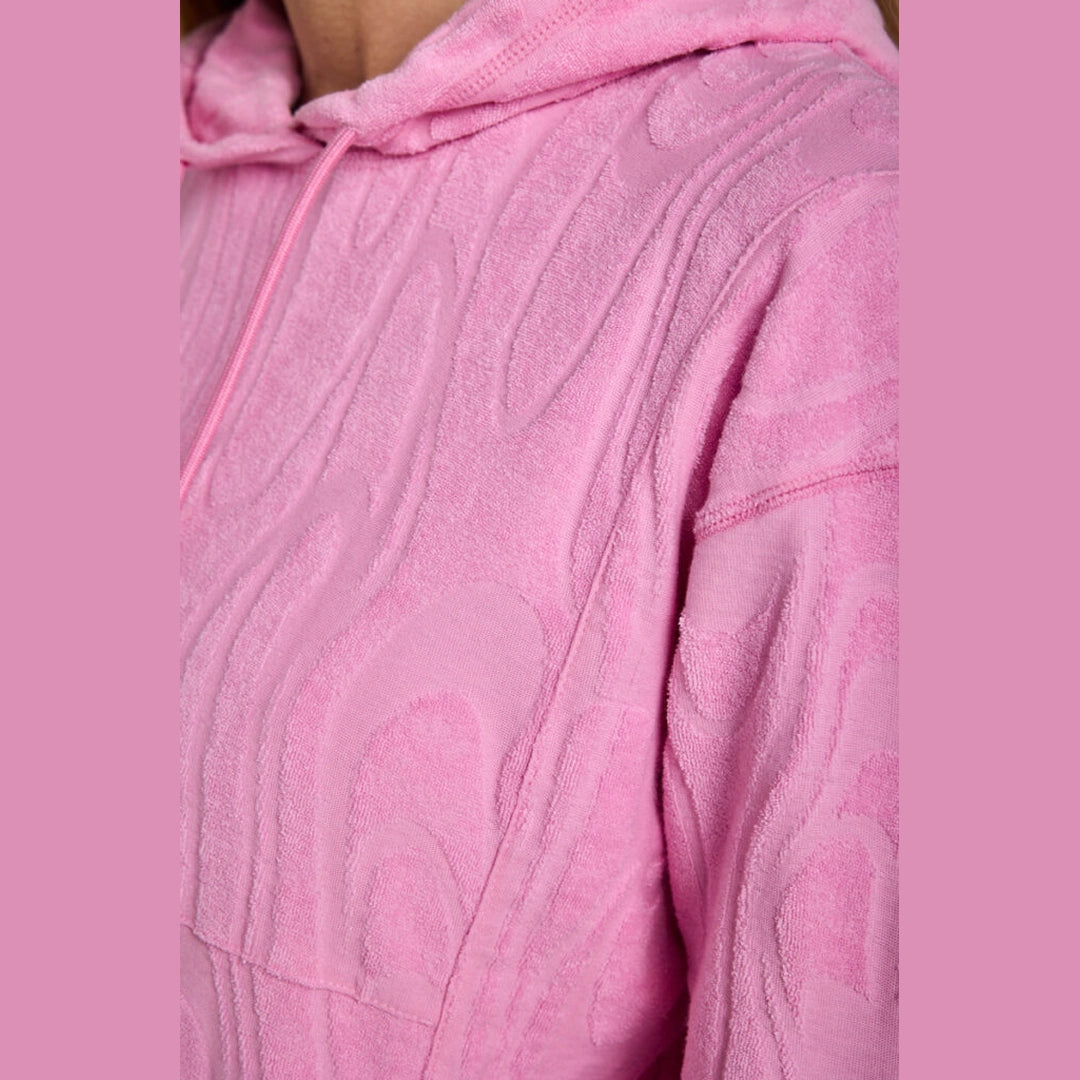 Disponible en rose ou beige, ce hoodie présente un motif jacquard subtil, des empiècements structurés, une capuche ajustable avec cordons, ainsi qu’une poche kangourou pratique. Un indispensable confortable, durable et stylé, parfait pour accompagner toutes vos journées.